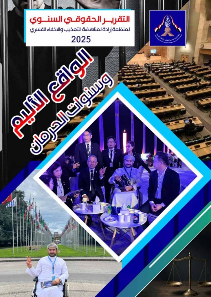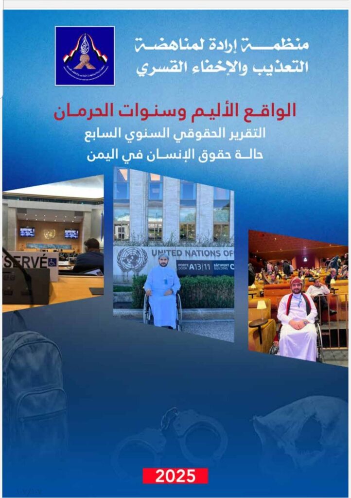 أصدرت منظمة إرادة لمناهضة التعذيب والإخفاء القسري تقريرها السنوي السابع بعنوان «الواقع الأليم وسنوات الحرمان – اليمن 2025»، في 107 صفحات، كاشفةً عن تصاعد واسع وخطير في الانتهاكات الجسيمة لحقوق الإنسان في اليمن خلال عام 2025، شملت الاعتقال التعسفي، والتعذيب حتى الموت، والإخفاء القسري، والقتل خارج إطار القانون، والتهجير القسري، وتدمير المنازل والممتلكات، وتجنيد الأطفال، في مشهد يعكس تدهوراً مقلقاً للأوضاع الحقوقية والإنسانية في البلاد.