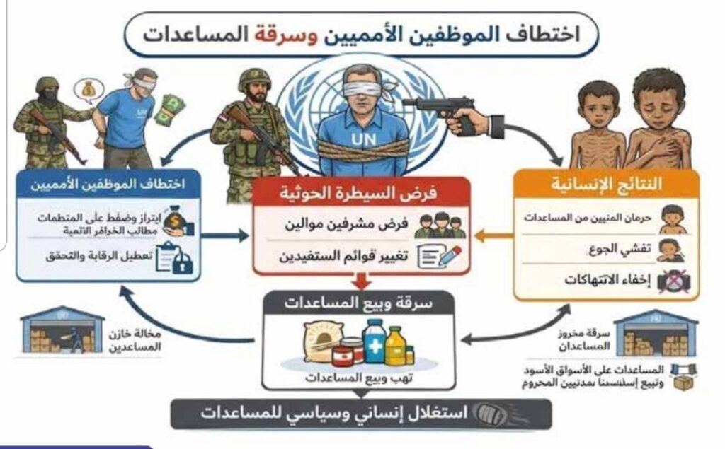 وتناول التقرير كذلك الانتهاكات التي طالت العمل الإنساني، بما في ذلك اختطاف موظفين أمميين وعاملين في برنامج الغذاء العالمي، ونهب المساعدات الدولية عبر أساليب احتيال منظمة قُدّرت خسائرها بملايين الدولارات، ما أدى إلى حرمان ما يقارب 48% من سكان مناطق سيطرة الحوثيين من المساعدات الأساسية، وتفاقم معدلات الفقر وسوء التغذية وتدهور الخدمات الصحية والمياه.