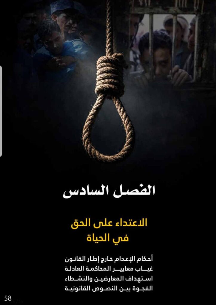 أما القتل خارج إطار القانون، فقد رصد التقرير تصدّر الحوثيين لحوادث القتل على الحواجز ونقاط التفتيش، خصوصاً في محافظتي الجوف والبيضاء، واقتحامات المنازل والقرى بنسبة قاربت 83% من إجمالي الحوادث، تلتهم ميليشيا المجلس الانتقالي بنسبة 17%، بالإضافة إلى توثيق 32 قتيلاً و19 حالة إعدام ميداني و218 جريحاً في غزو ميليشيا المجلس الانتقالي للمحافظات الشرقية، مدينة المكلا ومدينة سيئون ووادي حضرموت.
